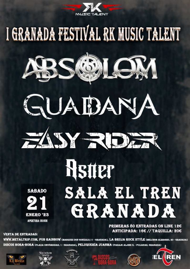 El pasado sábado 21, en la sala El Tren de Granada, se celebró la primera edición del RK Music Talent organizada por la propia agencia musical homónima. Un show impecable y espectacular de la mano de cuatro bandas nacionales de diferente procedencia y estilos muy variados. Desafiando al frío y a la noche, se coronó un debut festivalero digno del mejor metal existente y que no defraudó a nadie con un público muy entregado y con ganas de compartir unos buenos momentos con las bandas presentes. A su vez, el evento estuvo cubierto por varias revistas, así como el trabajo de muchos fotógrafos y prensa variada.