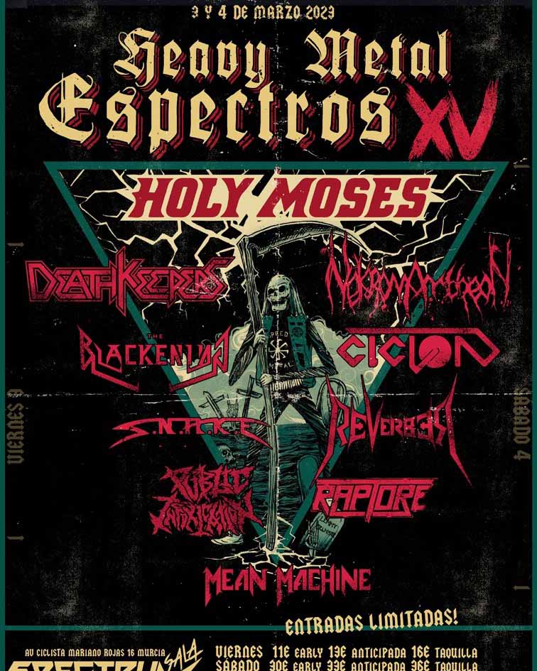 Con muchas ganas de conciertos, el público rockero y metalero de Murcia no faltó a su cita anual con la asociación Heavy Metal Espectros, la cual dejó claro que su decimoquinta edición iba a ser muy especial tras un contundente rastro de pandemia y parón musical en vivo. En una mezcla bien diversa de bandas nacionales e internacionales, el Espectros ofreció un espectáculo que, a pesar de ciertos fallos y alguna que otra cancelación, se llevó una gran cantidad de halagos y ovaciones de socios y asistentes de muchas partes de la geografía ibérica en la Sala Spectrum.