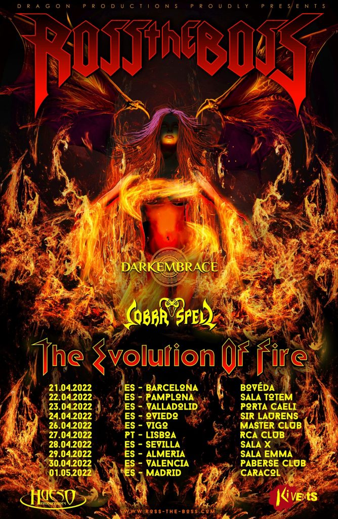 El primer día de Mayo se cerraría una gira que sorprendió a cada momento, fuera en las actuaciones, cambios improvistos o dificultades que añadirían mayor grandeza a los shows. Tres bandas de gran calibre se dieron cita en la sala Caracol de Madrid, donde la diversidad de estilos musicales creó un fantástico ambiente de la mano de Hueso Producciones. Un domingo muy especial que será recordado por los asistentes en toda regla. Casi al inicio del tour, los británicos Asomvel fueron sustituidos por una banda holandesa que tiene, ante sí, un futuro muy prometedor, Cobra Spell. La presencia femenina de intérpretes está liderada por la versátil Sonia Anubis, cuya guitarra se mueve entre géneros muy dispares, sea el death metal o el hard rock. En el siguiente lugar, el heavy metal más oscuro se halla en Darkembrace, una banda gallega con un toque muy variado de estilos que desemboca en un baño de sentimientos cargados de ira y dolor. No olvidamos la potencia vocal de Óscar, quien no defraudaría a sus allegados y fans más acérrimos. Por último, el magnánimo Ross the Boss, fundador de Manowar junto a DeMaio, nos deleitaría en un concierto repleto de sorpresas, fueran musicales, invitados, repertorio o cualquier otro aspecto que no se le escapó al clásico guerrero del metal que muchos veneran.